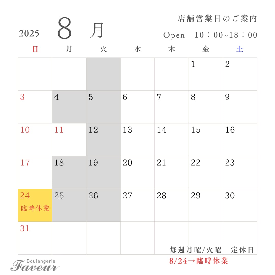 8月11日は通常営業いたします。8月24日は私用により臨時休業させていただきます。ご不便をお掛けし、申し訳ございません。お間違えのないようよろしくお願いいたします。